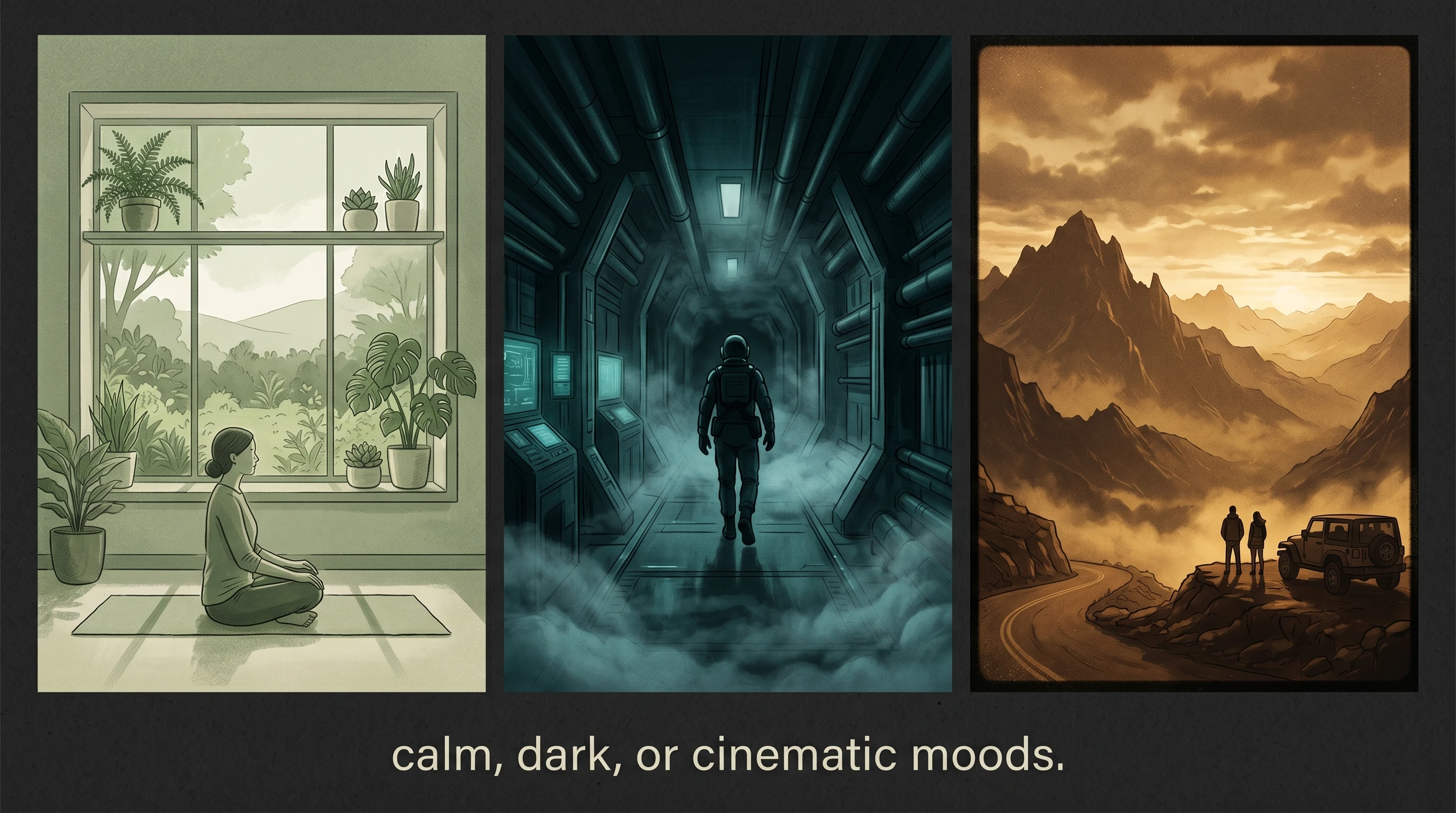 الأَمبينت لا يجب أن يكون هادئًا فقط — يمكن أن يكون مظلمًا أو سينمائيًا (مثل Eno's 1982 On Land). اختر calm للدراسة/النوم، dark للرعب/الخيال العلمي، أو cinematic لمقاطع دعائية وموسيقى خلفية وثائقية.