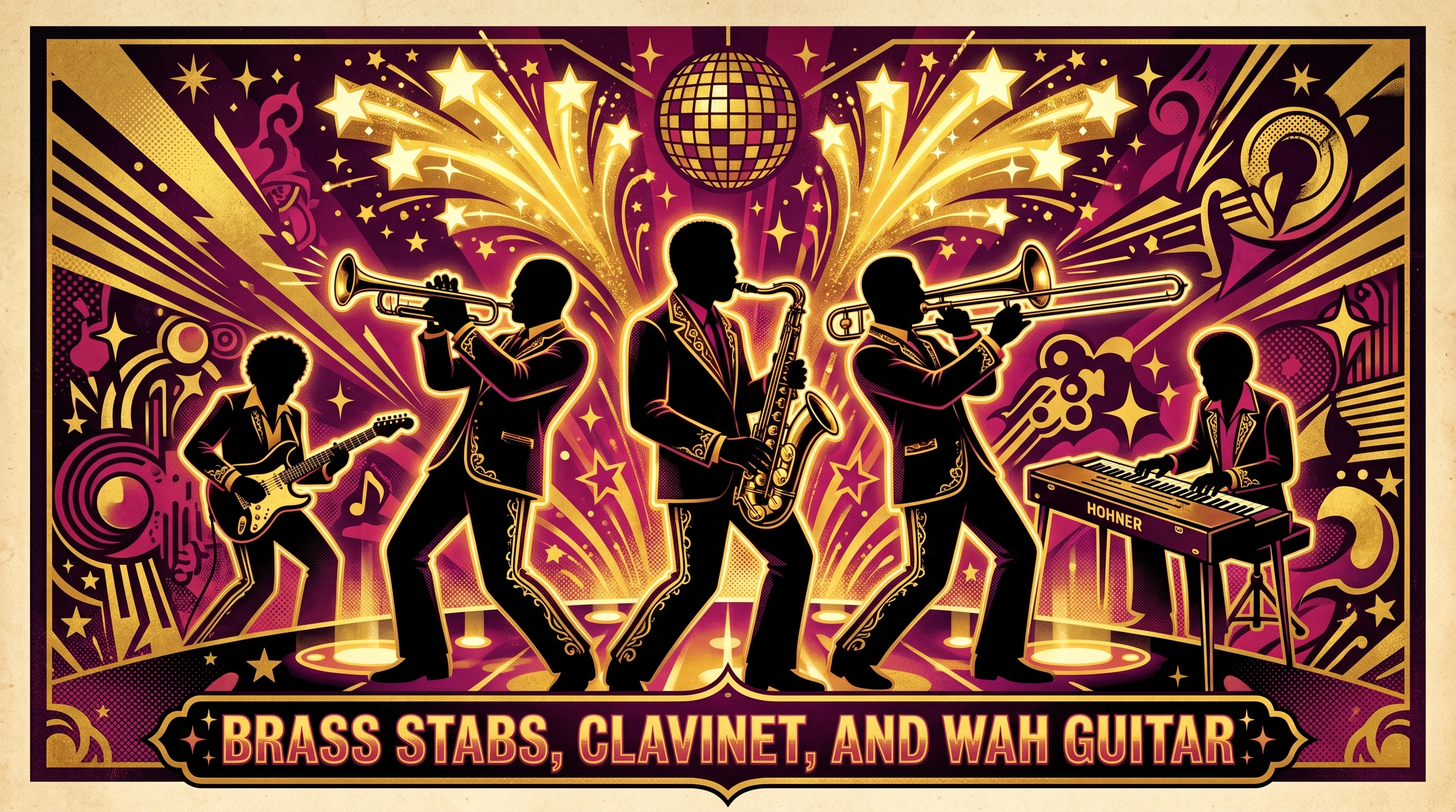 لوحة ألوان الفانك: ضربات الهورن على النوتات الخلفية، غيتار وا‑وا إيقاعي، clavinet إيقاعي، Rhodes، وبادّات أوتار للحظات الأهدأ. يمكنك طلب تشكيلة آلات محددة في الموجه.