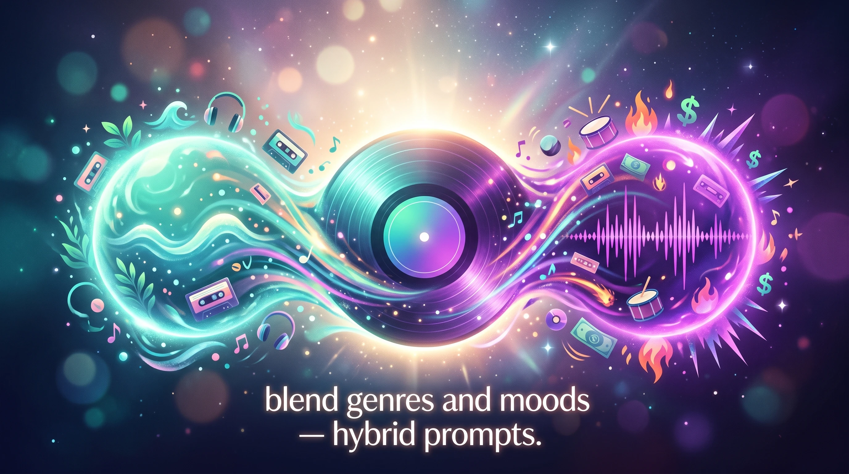 تعمل الموجهات المختلطة أيضًا — "lofi trap with jazz piano"، "country-pop with EDM drop"، "ambient metal". النموذج مدرَّب على تداخل ضخم بين الأنواع ويمكنه دمج الأساليب بطريقة تبدو متعمدة بدلًا من مدمجة بشكل عشوائي.