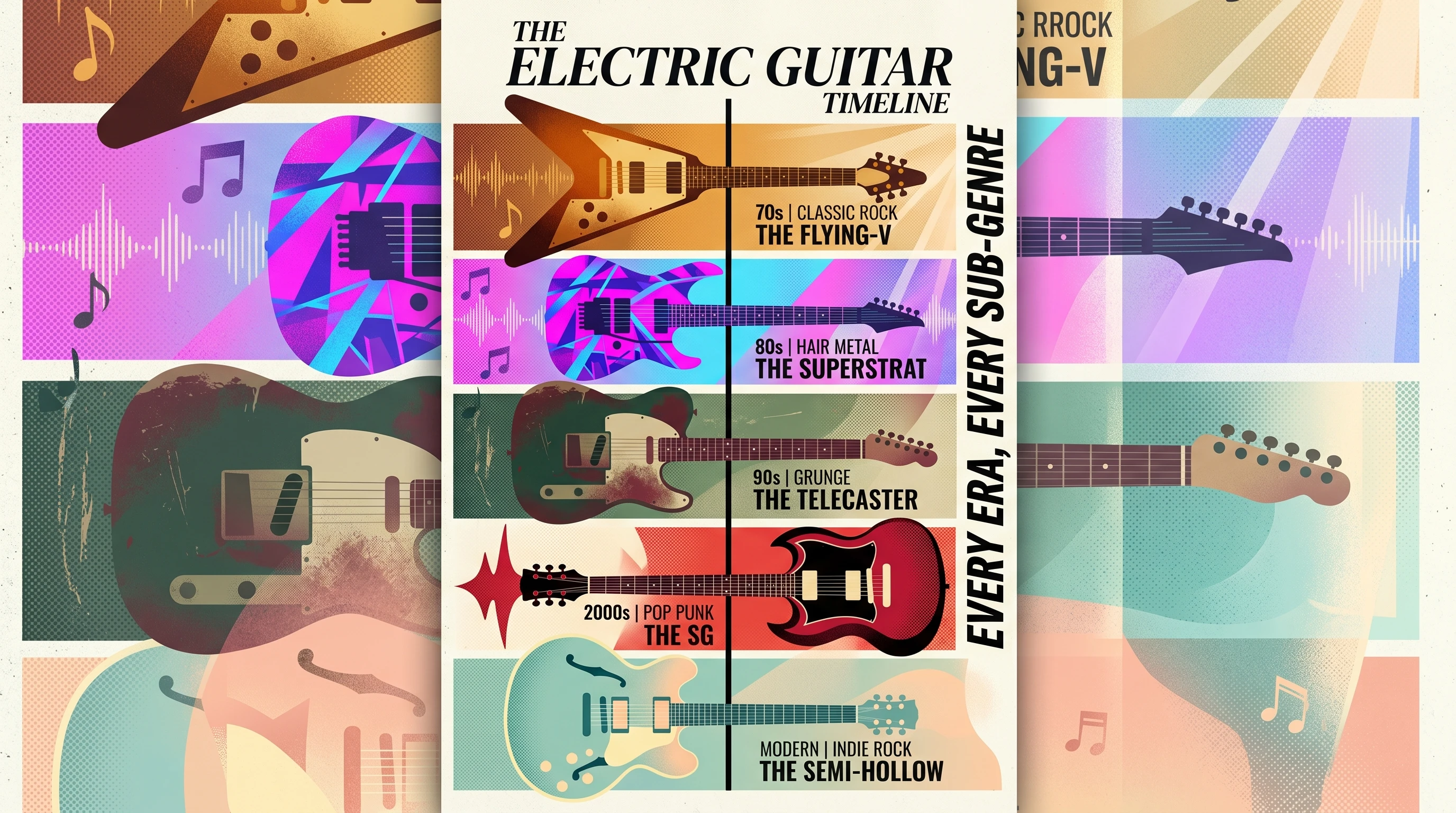 روك كلاسيكي من السبعينيات، أرينَا روك من الثمانينات، غرانج وبديل التسعينات، بوب‑بانك وإيمو الألفينيات، إندي روك، نهضة البوست‑بانك، غراج روك، هارد روك تقدمي — وصف العصر أو الفرعي‑النوع وCuty.ai يضبط أسلوب الإنتاج.