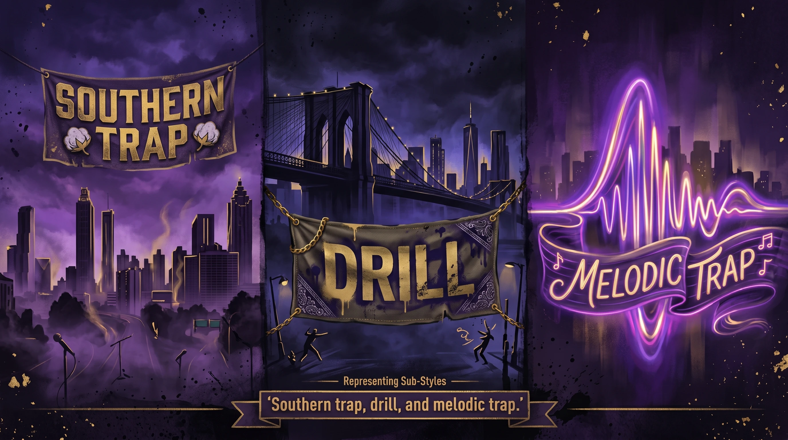 Classic Atlanta trap (Zaytoven/Metro Boomin school)، melodic trap مع هُوك أوتوتيوند، UK/Brooklyn drill مع 808s منزلقة، trap‑soul للعبور مع R&B، وتراپ سينمائي بعينات أوركسترالية.